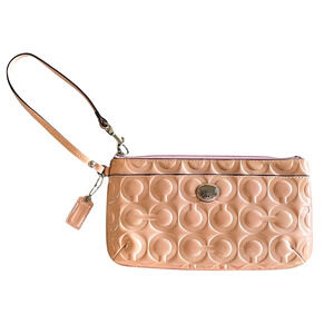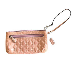 COACH Peyton OP Art Go-Go Peach Pink Tulle Patent Leather Embossed Top Zip Wallet Wristlet Clutch. Medium 8.25" x 4.5". Exterior Pockets. Interior Slots. Silver Coach Est. 1941 Medallion. Matching Coach Hang Tag. Style No. F49883. New With Exterior Markings On The Front and Back Bottom Most Likely From Storage. Care Card Enclosed. See All Pictures For Additional Description. (Originally $118.) Ships within 24 hours.