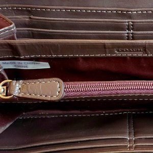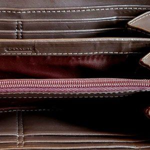 This PHENOMENAL Coach zip around wallet is brand new/unused and is a STUNNING color combination. Isn't ORANGE such a fun and happy color!!! With its coated canvas, she's sure to bring you lots of years of LOVE due to her scratch resistant and water resistant finish. AND AND AND she can hold most cell phones! How AWESOME is THAT! (please measure your phone prior to purchase, if you intend to use this with your phone). Back has a large pocket sleeve and inside boosts 4 x compartments (1 with a zippered closure), 12 x credit card sleeves, 2 x cash pocket sleeves. Dimensions: 7.75"W x 3.75"H x 1.75"D
