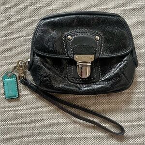 COACH Poppy Push lock Black/Silver Leather Wristlet in Italian distressed leather with Legacy lining