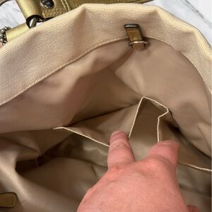 There is light discoloration throughout the canvas, especially near the lower front and back panels. This is common with older totes. Buyer could easily get this professionally cleaned. Some creasing is present on the gold leather straps from normal use, but all stitching is secure and the structure remains solid. The interior is in excellent condition with a clean champagne satin lining, a zip pocket, and two slip pockets with no staining or peeling. The bag retains its shape well and displays beautifully for its age. Style number D1069-15545.