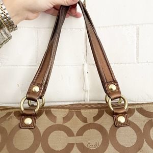 Poppy tote shoulder bag by Coach. Tan with signature CC jacquard design in brown with gold hardware. Front zipper pocket. Top zipper with interior zipper pocket and pouches. Exterior back has some wear as seen in photos but otherwise lots of life left. Interior is in great shape.