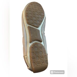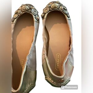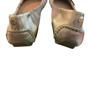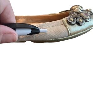 Coach Venus Gold Metallic Ballet Flat round toe. One tiny light smudge on side of shoe as shown in pics. Not noticeable but I like to fully disclose any minor flaw. No Box. Excellent condition.