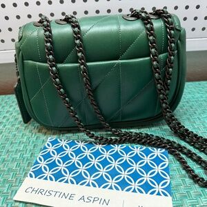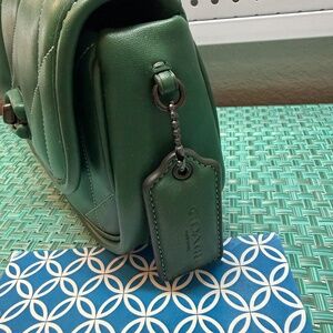 This is a COACH Quilted Pillow Madison 18 Shoulder Bag , style CA086, in Dark Pine (dark green) soft quilted leather with contrast stitching and gunmetal/black hardware. It has been gently used, but is in like-new condition with no flaws to note. Easily adjustable chains can be extended for crossbody carry, or doubled for shoulder carry. Dust bag and puffy Coach hang tag included as shown.Outside slip pocket, inside zip pocket, two credit card slots, turn lock closure.