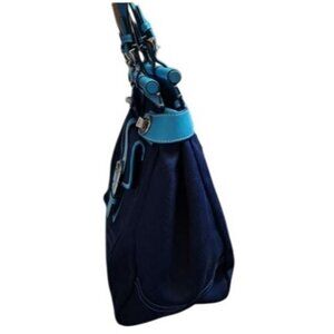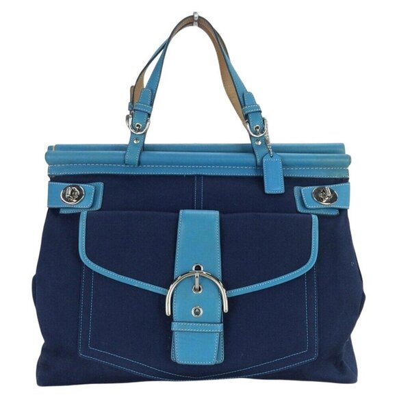 This limited edition Coach Soho Dowel Top Leather Satchel from 2004 is a rare find. Featuring luxurious blue canvas and leather, it offers sophisticated style and ample storage for essentials, making it a perfect accessory for any occasion.