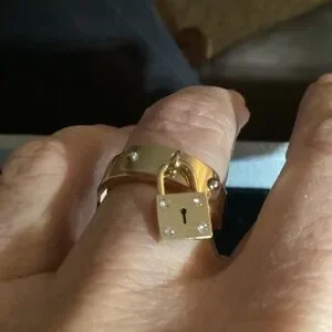 Coach ring with a dangling lock with crystals. Gold tone metal band. Brand new, NWOT.