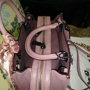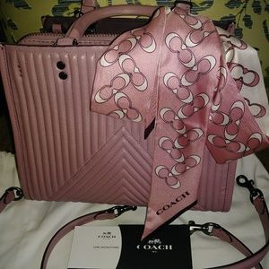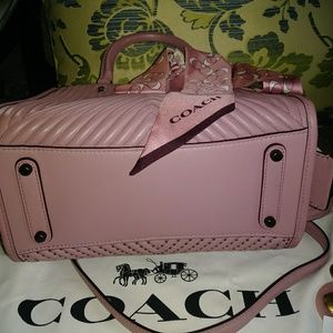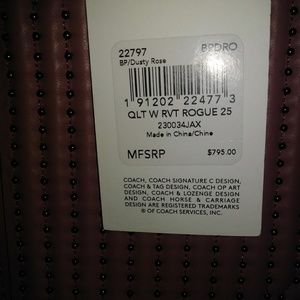 ๐SOLD๐1941 series ROGUE 25. Dusty rose leather with plum color suede lining. A very pretty bag. 3 compartments, inner zipper pouch and 2 cell/shades pockets. Quilted Cheveron revit pattern on front. 2 shoulder detachable straps. 9"L x7 3/4"H x 6"W. Retail $795.00 Coach signiture scarf and heavy cotton dust cover & brown store bag included. 1 x use like new. "C" ltr charm Retail $65.00 for added $30.00 to listed price.Thank you for stopping by๐