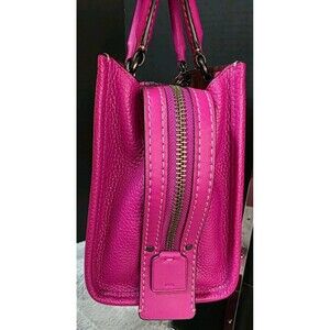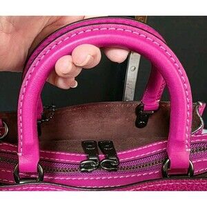 Introducing the stunning COACH ROGUE 25 handbag in a vibrant fuchsia color. This top handle bag is made of pebbled leather and features a zip closure, adjustable leather strap, and gun metal hardware. The medium-sized bag measures 9 3/4 inches in width, 7.5 inches in height, and 5.5 inches in depth, making it the perfect size for everyday use.