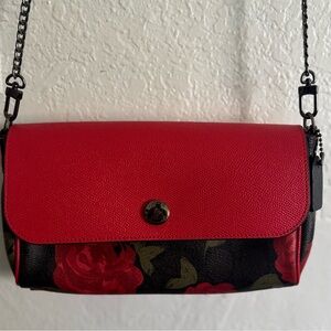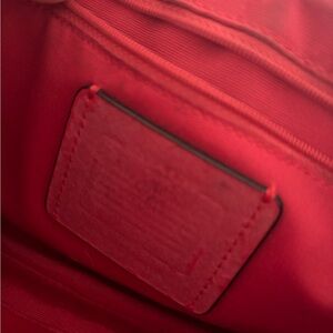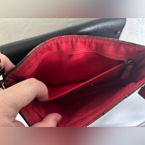 This bag is BEAUTIFUL. I purchased it second hand as a clutch with a missing strap but I’ve added a crossbody strap to match the hardware of the bag. The creed is damaged inside the bag and the exterior could use a cleaning. Exterior of the bag is pretty clean. It could be work as a clutch or a crossbody bag and the best thing about the bag is that it’s interchangeable. You can wear it as red or black. Zips are zippy and snap closure is snappy. Make an offer. She’s a rare bag, so she’s still worth the money.