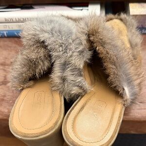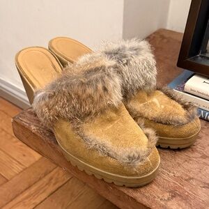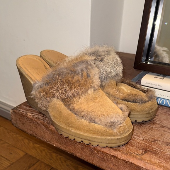 COACH Kaela Rabbit Fur Trim Suede Clogs Mules Wedge High Heels Shoes Size 7.5