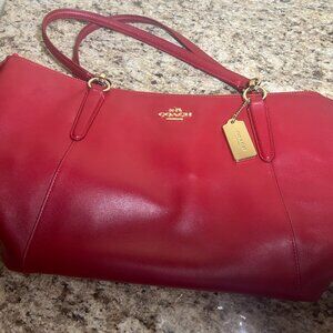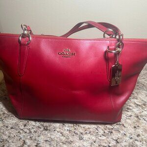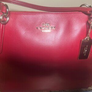 Red Soft Leather, Double Handle Top with some wear signs. Inside zip, multifunction pockets.