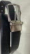 Elegant black leather belt featuring a sleek silver buckle. Perfect for any occasion. The metal part lifts up and twists to make it reversible