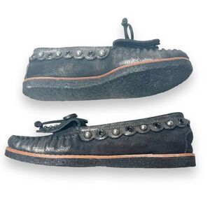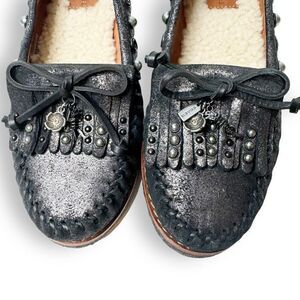 COACH Roccasin Black Metallic Leather Slip On Moccasins Sherpa Flat Loafers Sz 6 B
