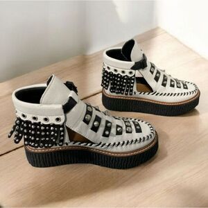 A tough but feminine take on the creeper, this bootie mixes Western-inspired fringe with ladylike cutouts and punk studs. Pair these with jeans, or with a dress for an unexpected look.