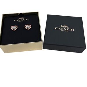 Brand new in box, never removed from card. Pretty stud heart shaped earrings features a center silver tone color with COACH logo etching. Sparkly pave crystals set in rose gold tone color surrounds the silver. Comes in a logo gift box. Perfect gift to yourself or for that someone special!