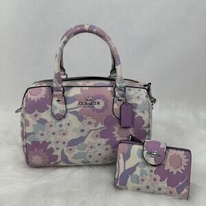 COACH Rowan Satchel Crossbody Floral Print Leather/Ivory + Corner zip Wallet NWT