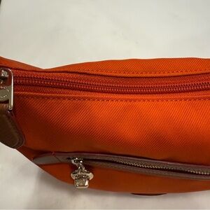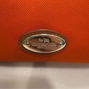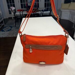 Excellent like new condition. Women’s Coach crossbody bag. Tangerine (orange) adjustable strap, gold logo, leather trim, inside pockets. MSRP $189