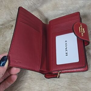 COACH SIGNATURE MEDIUM CORNER ZIP WALLET, BROWN, BLACK AND RED - NEW