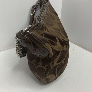 COACH SOHO SATEEN SIGNATURE HOBO 12675 Made of gorgeous Coach Sateen Signature fabric with brown patent leather trim Zippered top closure with leather pull; polished nickel hardware 18 inch (10 inch drop length) adjustable leather strap Fully interior lined with matching fabric lining; two slip pockets and large zippered pocket
