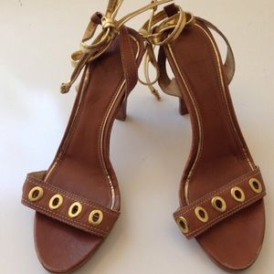 COACH STRAPPY SANDALS ~~ GORGEOUS BROWN LEATHER, GOLD GROMMETS, GOLD METALLIC STRAPS FOR WRAPPING AROUND YOUR ANKLES. EXCELLENT CONDITION - UPPER SOLE WAS DYED SO BOTTOMS LOOK ALMOST NEW.
