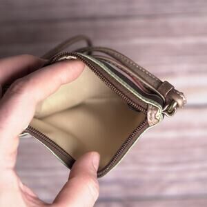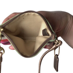 Elevate your accessory game with this COACH satin striped wristlet, a perfect blend of Y2K charm and modern elegance. Featuring rose gold trim, gold-tone hardware, and a signature COACH charm, this mini bag is ideal for carrying your essentials in style. The design includes a front slip pocket and a main zippered compartment, offering both form and function. Made in India and gently used with no visible flaws.