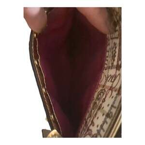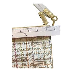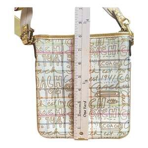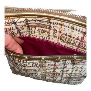 COACH Script Signature Graffiti Small Crossbody Bag Khaki Metallic Canvas Y2K. Unique Print: The bag features the classic khaki signature "C" canvas overlaid with an all-over script print that includes various Coach lettering and accents.