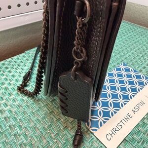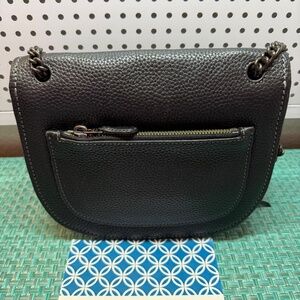 This is a COACH Shadow Crossbody Bag in thick, pebbled black leather, style 37000. This is a sturdy bag with thick beautiful leather, and although it does show some wear from use/storage, it's still beautiful and very wearable! Bag features adjustable chain straps that can be extended for crossbody wear, or doubled for shoulder wear. The shoulder strap and leather hang tag feature a cool whipstitch design. The overall vibe is edgy with a biker style.