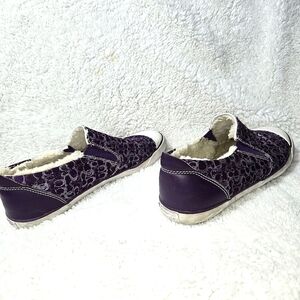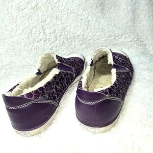 These size 8.5 Designer Coach Leatherware sneakers feature a striking purple w/ silver monogramed COACH pattern on the upper fabric, with sherpa lining for comfort and style complemented by white rubber toe caps and soles. Designed for easy wear, the slip-on style ensures comfort and a casual look. They are $200 ish new, and while they need cleaned up a bit on the white rubber soles... those soles are way down there and not blown up by a digi cam ;). They have lots of life left in them!! Yours for $40 or make me an offer!!