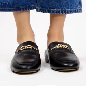 Elegant COACH Sienna Slide Black Leather Slip-On Loafers with gold accents in excellent Pre-owned Condition. Used only once for few hours inside my house. Like brand new without box. Size 9. What you are seeing in the photos are the shoes in their current condition. Perfect for any occasion.