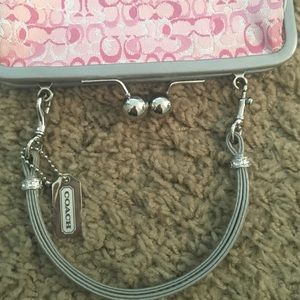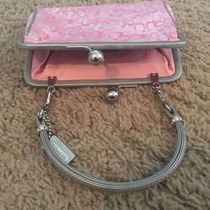 Lightly used Silver/pink COACH Sig C Jacquard pattern event mini. Used once for a wedding. No scratches, millimeter size black pen ink stain (size of a pen tip) no other stains minus that. This bag is Authentic and was bought at a COACH retail store.