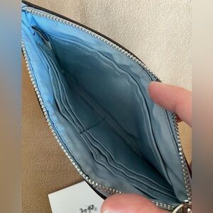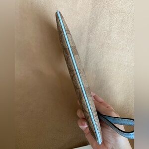 COACH Signature Beige Wristlet with Light Blue Leather Trim EUC