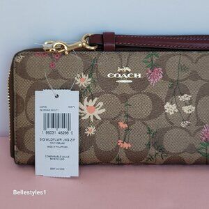 BRAND NEW WITH TAGS. Khaki Multi color. A long zip-around wallet is perfect to keep your essentials secure. Crafted from Signature coated canvas with wildflowers print and a detachable leather wrist strap.