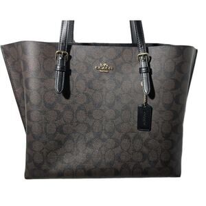 * The COACH Signature Dark Brown Black Mollie Tote Bag 1665 is a large rectangular tote bag made of leather with gold-plated hardware accents.