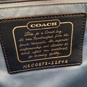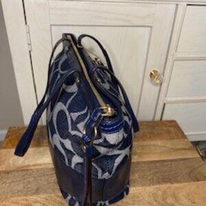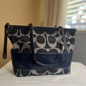 Authentic Coach Signature Stripe Denim Tote with "C" jacquard canvas with navy blue patent leather trim and stripe accent. Spacious, durable, and stylish; perfect for everyday use, work, or travel.