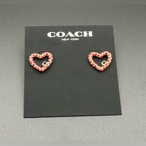 Stunning Coach heart-shaped stud earrings. These feature a beautiful pave of faceted red crystals set in a gold-tone finish, accented with the iconic "C" logo charm in the center. Perfect for Valentine’s Day, a romantic gift, or adding a pop of color to your everyday look! Heart-shaped studs with signature C logo. Gold-tone hardware with Red crystals. New without tags (NWOT). Never worn. Original Coach bubble packaging as shown. Retail value $68.