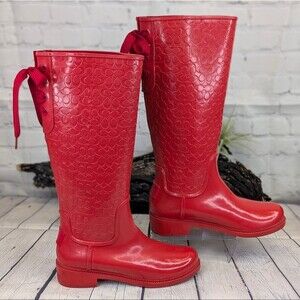 Step into rainy days with confidence and style in these COACH Signature Logo Lace-Up Rain Boots. Constructed from high-quality, glossy red rubber, these boots keep your feet dry and fashionable. The iconic COACH signature pattern adorns the upper part, adding a touch of luxury. The lace-up detail at the back enhances both fit and aesthetics, ensuring you look chic even in the rain.