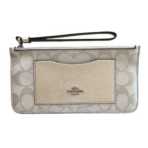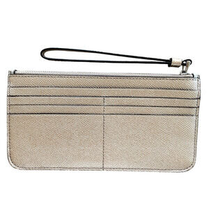 COACH Small Metallic Gold Signature CC Pattern Colorblock Leather Zip Top Wallet Wristlet. Style F39672. 7.75" x 4.25". Metallic Crossgrain Leather. Inside Open Compartment. Zip Top Closure. Seven Exterior Credit Card Slots. Full Length Bill Compartment. Attached Wrist Strap. Silver Coach Logo. Excellent Like New Condition. Originally $150. Ships within 24 hours.