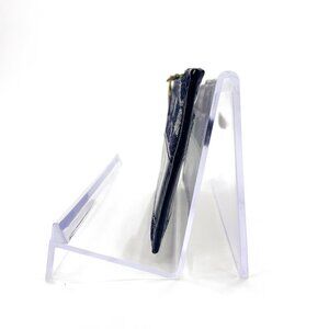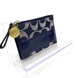This Coach Signature Mini Card Case Holder w/Key Ring, Blue patent leather trim, brass Coach logo, 1 key ring and chain and 1 exterior credit card slot.
