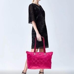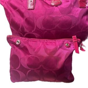 Coach 2pc Nylon Packable Weekender Bag & Pouch. Coach bag color is SV/ Pink berry in a Signature Nylon Fabric w/ includes matching berry tote case, see photos. Made in China Tag inside.