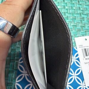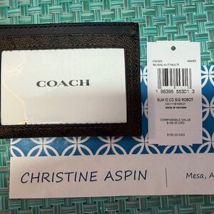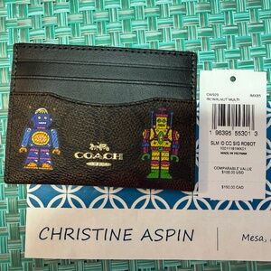 This is a COACH Signature Robot Slim ID Card Case, style CW929, in Walnut Multi with gold tone hardware. This little cutie is coated signature canvas in brown trimmed with black smooth leather, with adorable and colorful space robot illustrations on the front. Card case is NWT and never used.