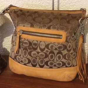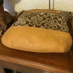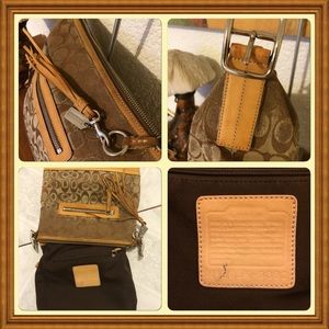 Canvas shows a lot of wear. Strap is missing. All zippers work well. Buckle on each side. Fully lined in brown cotton fabric. Leather trimmed. Zip and two media pockets inside. Bottom leather panel in very good condition. Leather aging. Zipper pulls. Tassel. Silver tone hang tag. L 10.5" H 11.5" W 3". ID# E05K-9362