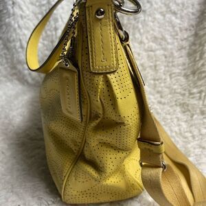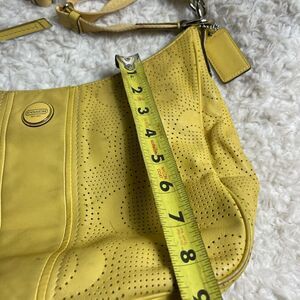 COACH Signature Stripe Convertible Hobo Bag Yellow Perforated Leather F23241 top zipper the inside lining has a side zipper two side pockets.pre owned in good used condition small stain on the lining see all pictures any questions please message.B11