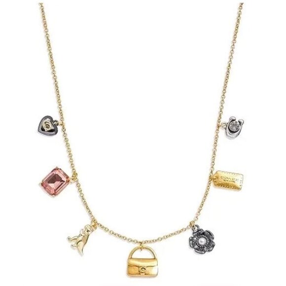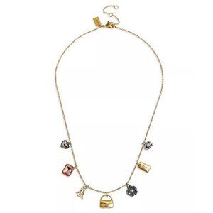 Refined chain necklace adorned with mixed signature charms at front including, iconic Tabby handbag, tea rose, Rexy dino mascot, sculpted C, heart, hangtag and stone gem.