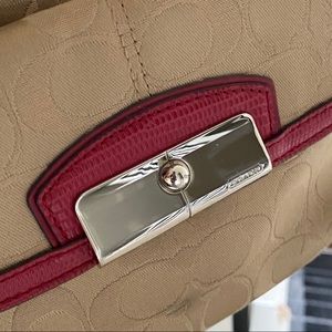COACH signature C fabric/leather trimmed in cranberry red accents with silver hardware