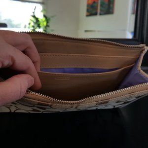 In the inside - 6 credit card slots, 3 long bill slots. One outside slot. Small ware on inside.