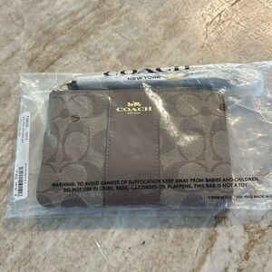 New with tags. Coach signature print wristlet. Comes with original tags and in original packing. Approximately 4 x 6”