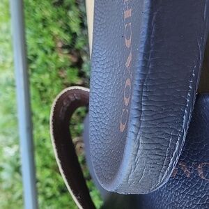 This Coach Signature Slide in charcoal gray base and brown signature canvas is the perfect addition to your summer wardrobe. The slip-on style and open-toe design make it easy to wear, while the rubber outsole provides durability and comfort. The geometric pattern on the upper adds a touch of style, making it perfect for any occasion. This sandal is available in US shoe size 11 with a D shoe width. The insole and upper materials are also made of rubber, providing added comfort and durability. Only worn once