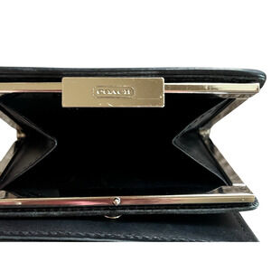 COACH Small Soft Black Leather Classic Bi Fold Silver Coin Purse Wallet Cards Bills. VINTAGE. Approximately 4" x 4". Credit Card Slots. Change Purse. Bill Compartment. Excellent Condition. Ships within 24 hours.