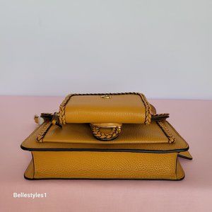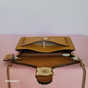 BRAND NEW WITH TAGS. Buttercup color. A chic structured Tabby Clutch with chain & leather strap for crossbody wear for your small essentials. Designed with a flap with Push-lock closure with braided leather trim, finished with a tonal leather covered Signature C logo. Crafted of Polished pebbled leather and refined calf leather. Features an interior zip pocket, a slip pocket and 8 credit card slots.