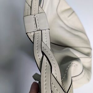 Coach Cream Soho Dylan Leather Hobo Shoulder Bag. Small, but still has plenty of room. Accent stitching, interior zippered pocket and zippered main closure. Features a wide braided adjustable strap, with Coach signature brass hardware,
