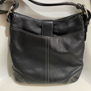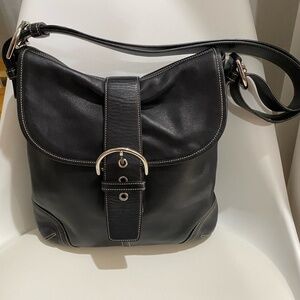 COACH Soho black leather shoulder/crossbody bag with original dust bag. Flap closure and multiple interior pockets. 24" strap drop, 11" x 10" x 4".